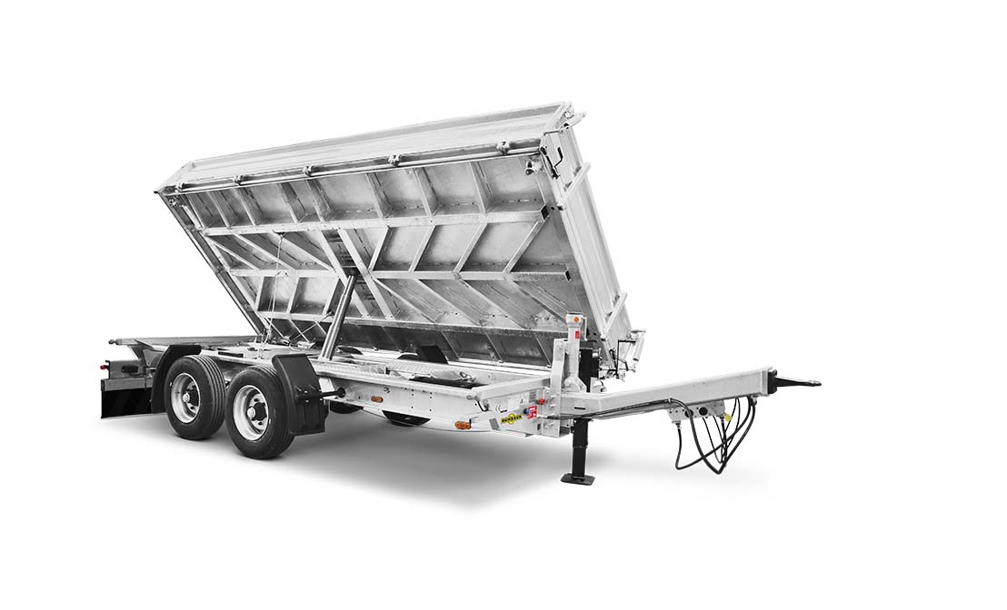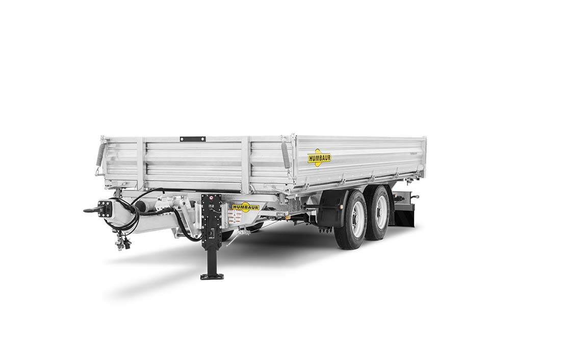 The HTK with a gross weight above 10 t is a variable all-rounder. It is particularly impressive with its five-stage hard-chromed cylinder and hydraulic motorised threeway tipper. It has a sturdy, welded, hot-dip galvanised frame for optimum stability and safety. The platform floor is made from 4 mm fine-grained steel. The 500 mm high hinged drop sides with central lock can be folded down at the sides and rear and removed.