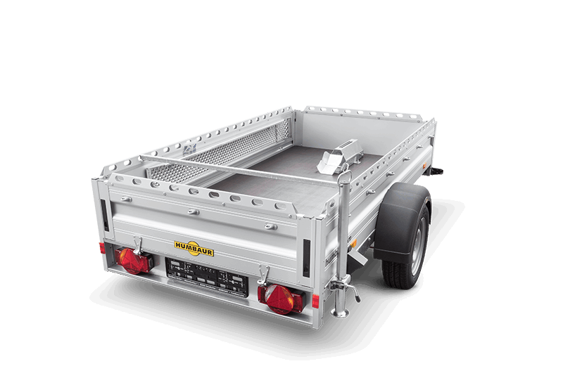 Humbaur Multifunktionsbeleuchtung mit Rückfahrscheinwerfer im Unterfahrschutz integriert.