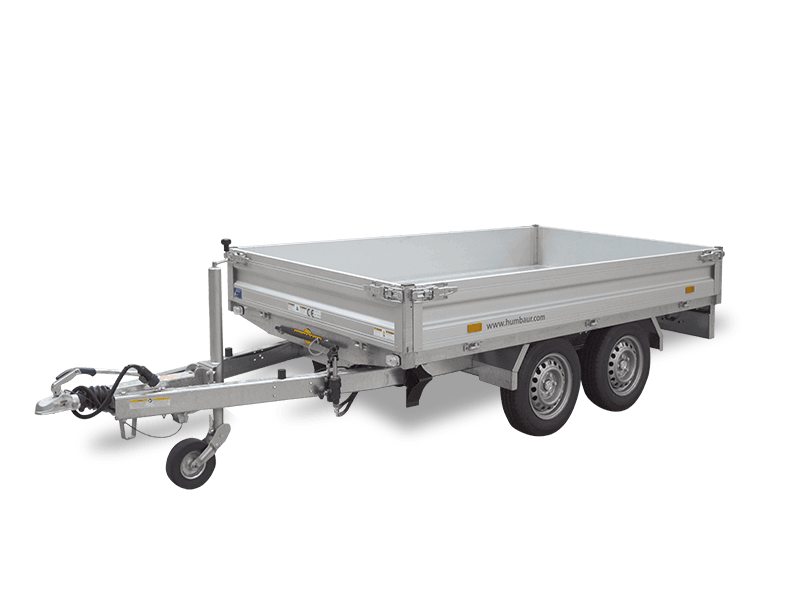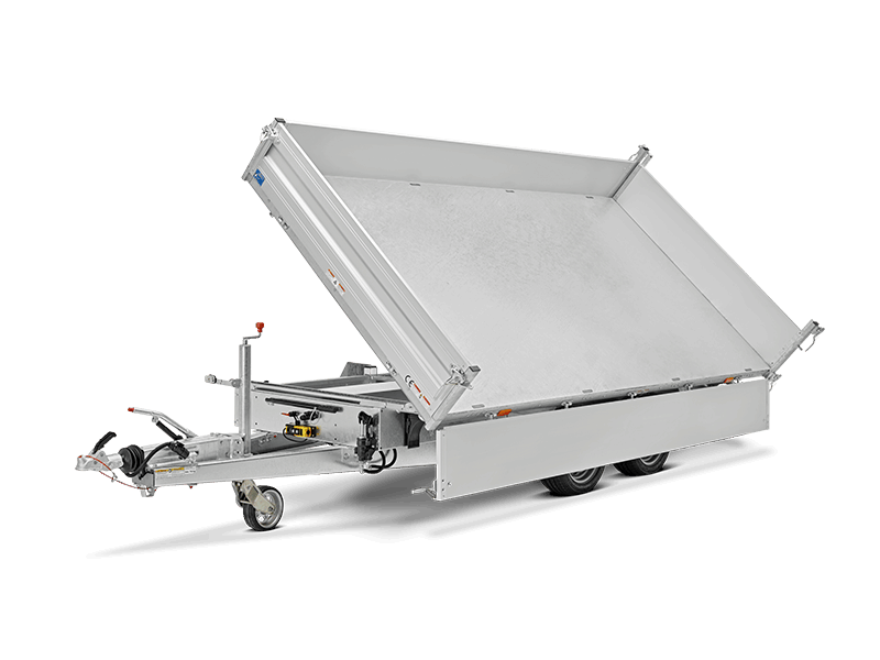 Les bennes HUK sont disponibles avec 1 ou 2 essieux. Ces remorques se caractérisent notamment par leur pont en tôle galvanisée avec timon en V et leurs anneaux d'arrimage intégrés. Leur angle de basculement est de 45 degrés. Tous les modèles peuvent être équipés d'une pompe électrique et de rehausses grillagées ou pleines en aluminium.
