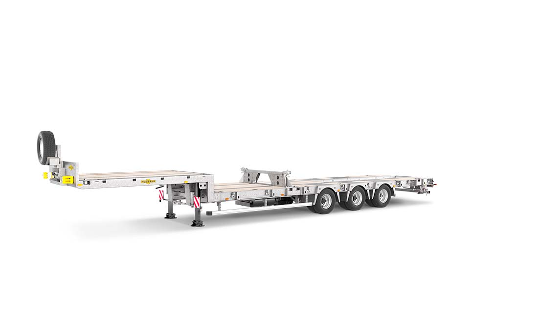Les semi-remorques surbaissées soudées se démarquent grâce à leur plateau surbaissé droit ou coudé et à leur faible poids à vide ! Les entrepreneurs du BTP peuvent y transporter des excavateurs, des chargeuses sur pneus, des finisseurs et autres engins de travaux lourds dans le plus grand confort et en toute sécurité. Grâce au pivot mobile, la semi-remorque s'adapte à des véhicules tracteurs à deux ou trois essieux ! Les semi-remorques surbaissées peuvent également être utilisées pour transporter des conteneurs.